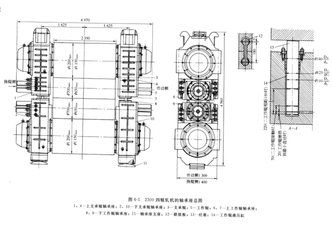 上支承輥軸承體****有兩(liǎng)個耳朵 (見圖 6-5),其作用是將軸承座掛在平衡杠杆上。 整個上支承輾軸承座、壓下螺絲及平(píng)衡杠杆的重量通過平衡杠杆係統由位於機架****的(de)個大液壓缸來平衡。在下工作輥軸承座內,有平衡上工作(zuò)輥、軸承(chéng)、軸承座和上支承輥用的液壓(yā)缸(圖6-5中 A—A剖視)。