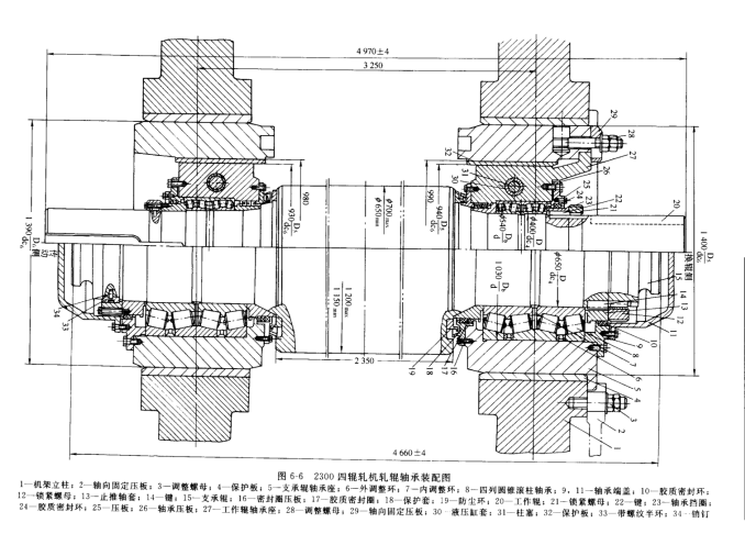 圖 6-5 所示為 2300四輾軋,機的軸承座總圖。四(sì)輥(gǔn)軋機(jī)支承輥軸承座為與一門型架 (圖6-5中的1、2),考慮到調整軋件厚(hòu)度的需要,軸承座(zuò)在(zài)機架窗口內(nèi)應能上下移動,故(gù)其配合一般取 D./dc;2300 鋼板軋機取 D6/dcs。工作(zuò)輥軸承座裝置在門型架中(zhōng)。為保證軋輥磨(mó)損後,工作輥仍能與支承輥相壓緊,工作輾(niǎn)軸承座在門型架中應能上下移動,其配合(hé)也取D./dc,。
