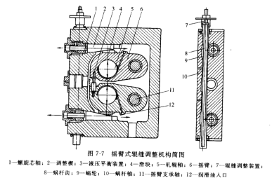 ④ 軋輥軸安裝在搖臂(bì)裏(見圖 7-7),能夠(gòu)在一個較大(dà)的範圍內對稱(chēng)調整輥縫,從而使軋製線保持恒定。這對於穩定軋製工藝,減少生產事故(gù),提(tí)高軋機作業率是(shì)十分有利的。輥縫的對稱調整是通過蝸杆蝸輪帶動(dòng)調整楔水平往複移動(dòng),使裝(zhuāng)在上下搖臂中的軋輥軸繞搖臂支承軸轉動,再加上液壓平衡缸的作用(yòng)而實現的。