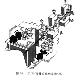 德馬克無扭(niǔ)高速(sù)線材軋機與摩根軋機一樣,采用偏心套式的輥縫調整機(jī)構和外齒傳動,則在調(diào)整輥縫時必然引起軋輥軸齒輪齧合中心發生(shēng)變化。克虜伯軋機為了克服軋輥軸齒輪齧合中心變化的缺點,在采用偏心套式輯縫(féng)調整機(jī)構(gòu)的同時,采用了內齒輪傳動。而目采用偏心套(tào)式輥縫調整機構在結構 上縮小了軋輥軸(zhóu)的軸頸直徑,從而限(xiàn)製了精軋的能力。實踐證(zhèng)明,偏心套座孔由於長期的脈動載(zǎi)荷作用而易於磨損,致使配合鬆(sōng)動,引起衝擊和(hé)扭振,高速(sù)時更甚。為此,德馬克公司設計了一套搖臂式調整輥縫的高(gāo)速線材軋(zhá)機,如圖7-7 所示。軋機的(de)布置形式有(yǒu)兩種∶一種與摩根式的相(xiàng)仿,各相鄰機架間互相成 90°角布置,且各自與水平麵交替上(shàng)下成(chéng)45°角;另一種布置形式是各相鄰機架間仍然互相成 90°角布置(zhì),但各自與水平麵交替上下成 15°/75°角,如圖7-8 所示。軋機(jī)的增速箱與分速箱結合起來,在一個箱(xiāng)殼裏(lǐ)。