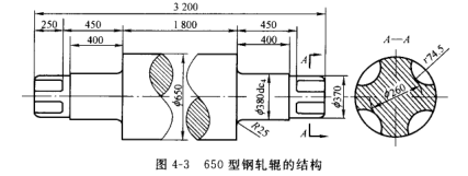 650型鋼軋輥的結構如圖4-3所示,型鋼軋輥的輥身上有軋槽(cáo),軋(zhá)槽又成(chéng)為孔型。孔型在輥身上的安排機尺寸取決於型鋼軋製工(gōng)藝要求,輥徑兩端(duān)的梅花斷(duàn)麵的(de)輥頭,已傳遞扭矩。輥徑安裝在軸承中,並通過軸承座和壓下裝置吧軋製力傳給機架。