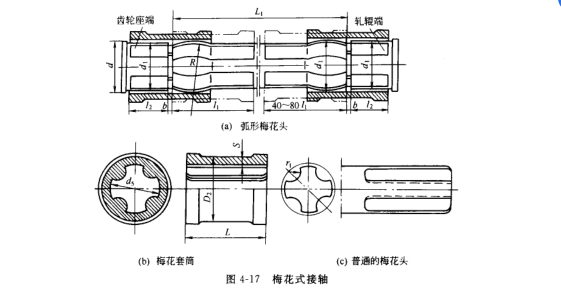 由於(yú)型鋼軋機軋輥間的徑(jìng)向(xiàng)調整(zhěng)量小,並且經常換輥,輥普遍采(cǎi)用梅花接軸,如圖4-17所示,這種接軸允許傾角為1°~1.5°的場合。而較大優點是換輥方便,缺點是運轉中有衝擊和(hé)噪音,在幹摩擦條件下工作(zuò),很容易磨損。