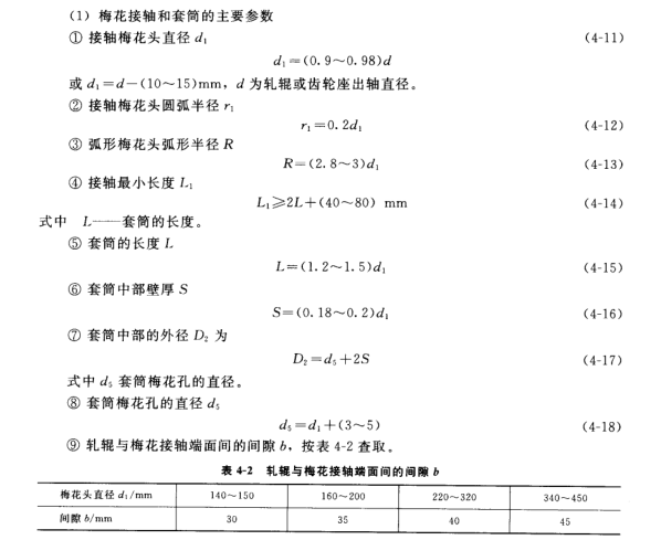 (2)梅花接軸材料(liào)  梅花接軸(zhóu)通常采用鑄鋼或鍛鋼,其(qí)材料性能為bs=5000~6000kg/cm2,∮=16%,梅花軸套一般用灰口鐵柱成,當應力較(jiào)大時,個別采用鑄鋼。