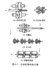 大外徑來表示。不同型號自動軋管機組的(de)組成有些不同,但都有斜軋穿孔機、自動軋管機、均整機、定(dìng)徑機和斜輾矯直機,如圖(tú)8-5 所示。