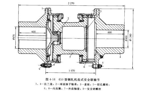 圖(tú)4-16所示為650型鋼軋機齒式安全軸節,結構上是一個齒輪聯軸器,裝設在減速機與齒輪座之間。